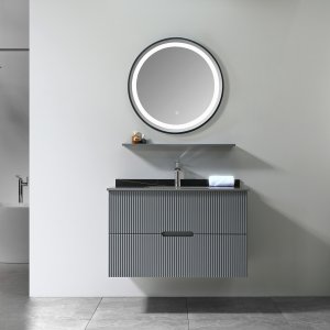 Badrumspaket Lazien kombinerar modern design och funktionalitet på ett stilrent sätt. Tvättställskommoden har en elegant ribbad yta i grå melamin, vilket ger ett subtilt men sofistikerat intryck. Den svarta marmorerade toppskivan i melamin är en lyxig detalj som lyfter hela möbeln och ger badrummet en modern känsla. Två rymliga lådor med mjukstängningsfunktion ger gott om plats för förvaring och håller badrummet organiserat och snyggt. Handfatet, tillverkat i vit keramik, har en elegant form som smälter väl in i den minimalistiska designen. Den medföljande runda spegeln med en metallram (Ø60 cm) och inbyggd belysning ger en perfekt balans mellan form och funktion. Den runda formen och den stilrena ramen kompletterar den moderna estetiken i badrummet och skapar en välkomnande atmosfär. Observera! Kran och bottenventil ingår inte, men kan köpas till.