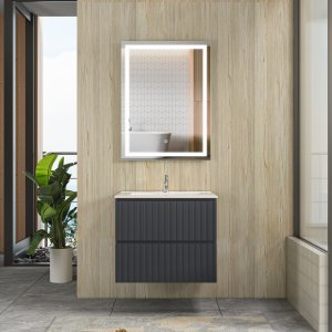 Skapa ett djärvt och modernt uttryck i ditt badrum med denna vägghängda kommod i matt mörkgrå ribbad finish. Den stilrena och ribbade designen ger rummet karaktär och en lyxig känsla. Den släta keramiska ytan på handfatet kontrasterar snyggt mot det strukturerade skåpet, vilket skapar en harmonisk balans mellan form och funktion.