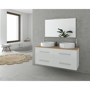 Torino möbelpaket från Nordamist ger ditt badrum en lyxig och modern touch med sitt vita, högglansiga vägghängda tvättställsskåp och två eleganta porslinshandfat. Den ekfärgade laminatskivan skapar en naturlig kontrast till den vita ytan och tillför en sofistikerad känsla till badrummet. Skåpet har rymliga lådor som ger gott om förvaringsutrymme, medan de två handfaten gör det perfekt för par eller större familjer.