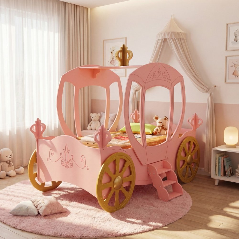Barnsäng Rosa | Prinsessäng | Med trappa och madrass (90×180 cm) är en charmig och fantasifull säng som förvandlar barnrummet till en magisk plats. Sängen har en praktisk trappa och står på hjul, vilket ger enkel förflyttning och flexibilitet. Konstruktionen i MDF, trä och HIPS-plast säkerställer stabilitet och hållbarhet, med en maxbelastning på 100 kg, vilket gör den lämplig för både barn och vuxna vid sagostunder.