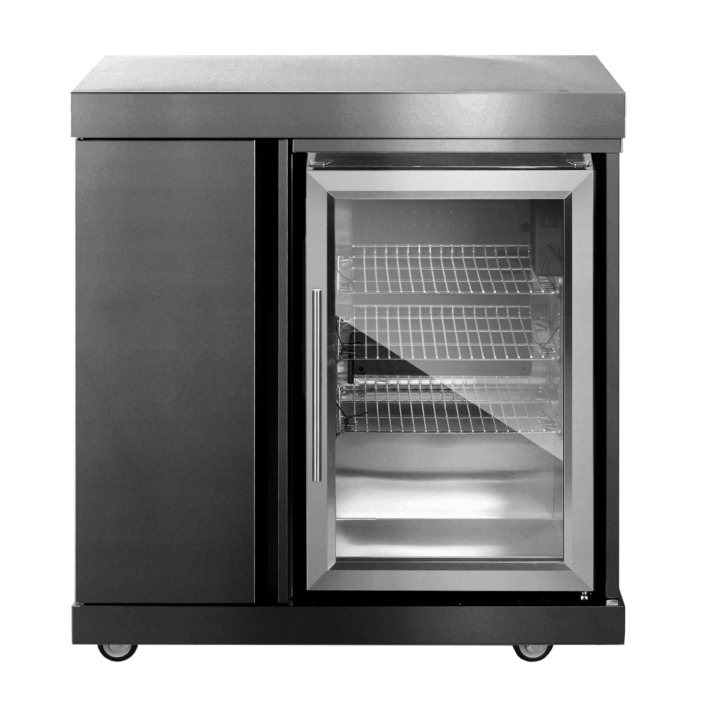 Fristående modul med kylskåp och smart skåpsförvaring vid sidan om. Modulen har en elegant svart design tillverkad i rostfritt stål 304SS, och har ett inbyggt förvaringsskåp som gör att du kan förvara dina tillbehör och samtidigt frigöra extra arbetsutrymme i ditt utekök. Kylskåpet har stilfull belysning, kompressorkylning och kan hålla 3-16°C, vilket gör att dina drycker redo att serveras vid alla tillfällen i uteköket – dessutom perfekt till sommarens grillfester!