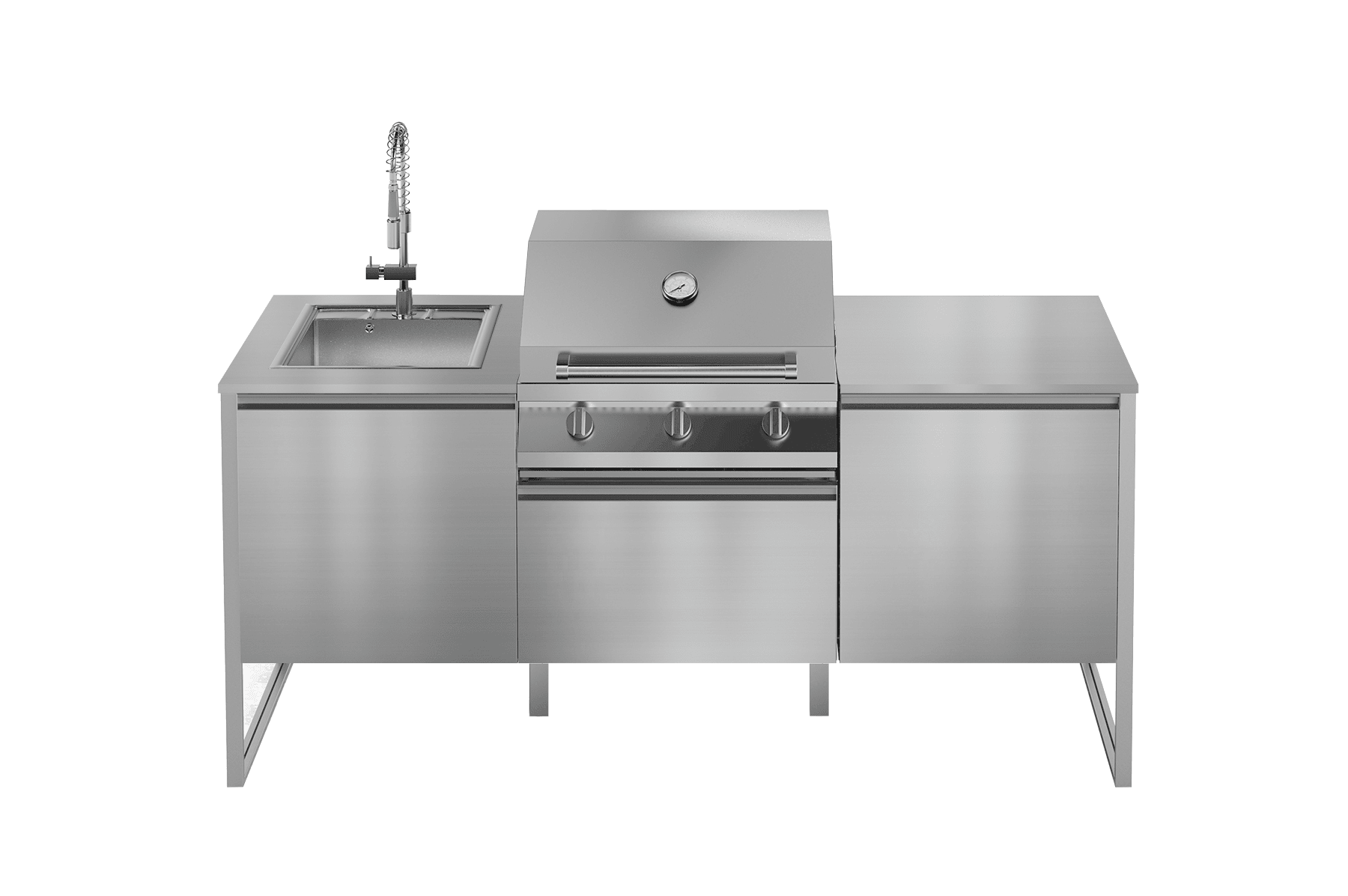 Latemar tillhör den nyaste serien Gea från italienska Steel och står för kompakt kompromisslöshet – på sin kompakta yta kombinerar detta fristående utekök nämligen alla funktioner som önskas av ett komplett utekök. Grillen bildar utekökets hjärta, medan diskhon med dess utdragbara vattenkran och de smarta förvaringsmodulerna tillför all nödvändig funktionalitet. Exteriören på alla moduler och grillen är tillverkad av AISI 316 rostfritt stål av marin kvalitet – ett material som också används vid konstruktion av båtar för att stå emot extrema förhållanden. Den stiliga arbetsytan av ett slitstarkt, för utomhusbruk anpassat material matchar utekökets raka linjer. Allt detta gör Latemar otroligt robust och hållbart, samtidigt som det behåller en elegant och modern design med kompromisslös kvalitet som håller över tid.