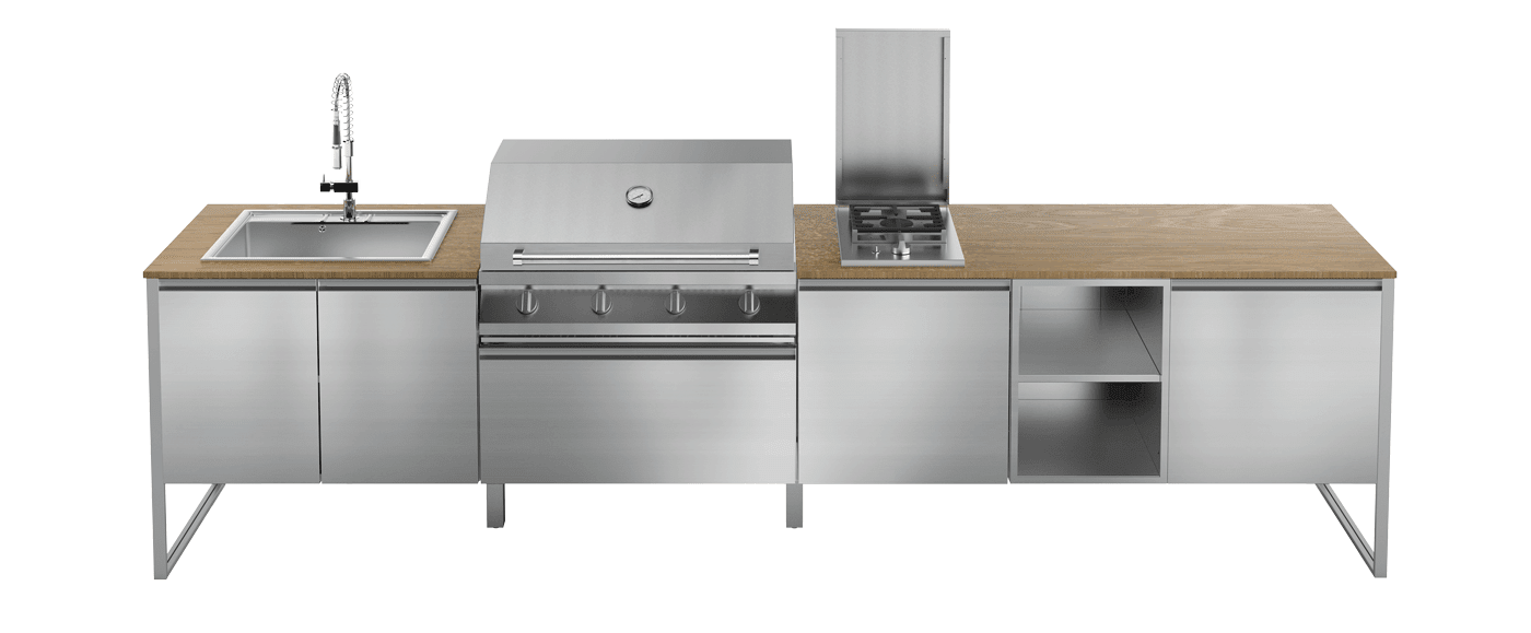 Med det fristående uteköket Marmolada ur deras nyaste produktserie Gea erbjuder italienska Steel ett komplett utekök med alla bekvämligheter som inte lämnar någonting kvar att önska. Den generösa grillen är utrustad med ett dubbelskiktat, isolerat lock med inbyggd termometer och kompletteras av en sidobrännare som erbjuder extra grillyta. Den stora diskhon med utdragbar vattenkran smälter perfekt in i den moderna kombinationen av olika material och färger. Allting kombineras med smarta förvaringsmoduler och stilig arbetsyta av slitstarkt, för utomhusbruk anpassat material. Exteriören på alla moduler och grillar är tillverkad av AISI 316 rostfritt stål av marin kvalitet – ett material som också används vid konstruktion av båtar för att stå emot extrema förhållanden. Detta gör Marmolada otroligt robust och hållbart, samtidigt som det behåller en elegant och modern design med kompromisslös kvalitet som håller över tid.