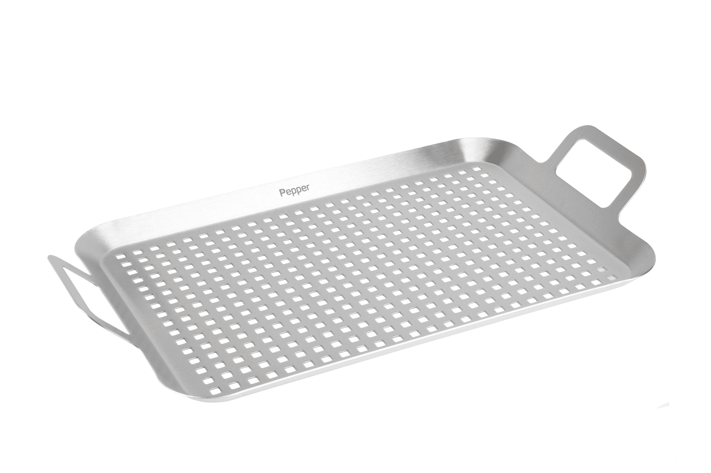 Bricka i slitstarkt rostfritt stål att använda vid grillning, när du vill undvika att livsmedel glider ner mellan grillgallren eller fastnar på dem. En grillbricka är det självklara valet när du vill tillaga mindre ingredienser som krispiga grönsaker, läckra skaldjur och små köttbitar eller känsliga ingedienser som fisk som annars lätt skulle gå sönder under grillningen. Grillbrickan är mycket smidig att placera och ta av från grillen tack vare handtagen på sidorna. Med en matlagningsyta på 44 x 25 cm har du fler möjligheter till en mångsidig matlagning med fantastiskt resultat – lätt och smidigt! Grillbrickan finns även i mindre storlek.