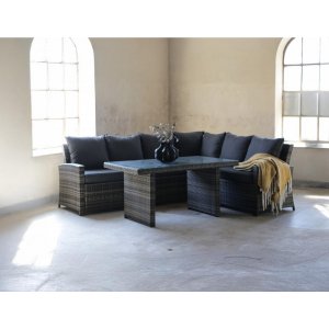 Kalmar är en klassisk soffgrupp i flat konstrotting med en stilren mörkgrå nyans som passar fint i de flesta utemiljöer. Den robusta aluminiumstommen gör den både vädertålig och stabil, med bekväma dynor i grå polyester för långvarig komfort. Perfekt för avkopplande stunder och trevliga sammankomster med familj och vänner utomhus.