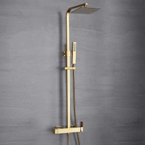 Detta eleganta duschset i mässing är en kombination av modern design och hållbara material. Med en fyrkantig form och en mässingsfinish blir detta set en stilren och funktionell detalj i ditt badrum.