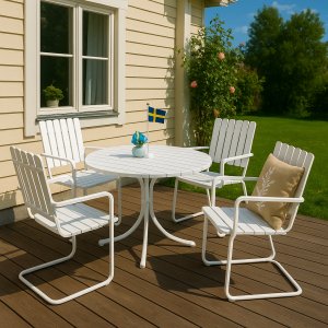 Upptäck den tidlösa klassikern, matgruppen Vaxholm i exklusivt fjäderstål och vitlaserad furu. Perfekt anpassad för den skandinaviska uteplatsen med sin mjuka svikt och klassiska design.