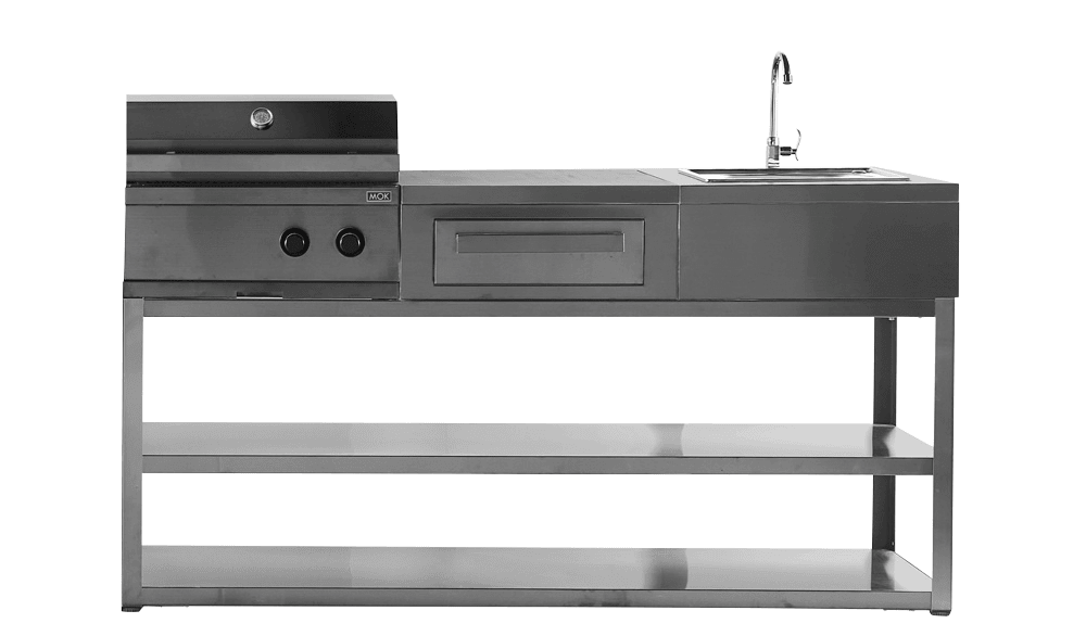 Reykjavik – modernt mindre fristående modulkök med skandinaviska linjer och personliga detaljer. Ett lättplacerat utekök med läcker och stilren svart design, som erbjuder alla praktiska förnödenheter som ett användbart utomhuskök kräver. I detta paket ingår en vask, skärbräda med förvaringslåda och en gasolgrill med två brännare. Ett utekök för dig som önskar en nära matlagningsupplevelse eller som har begränsad utrymme på uteplatsen.