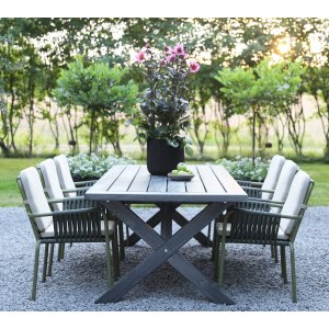 Denna eleganta utemöbelgrupp består av ett Oxford-bord i gråbetsat trä tillsammans med sex Lincoln-trädgårdsstolar i grön aluminium. Perfekt för stora uteplatser och terrasser där den generösa ytan erbjuder utrymme för trevliga middagar utomhus.