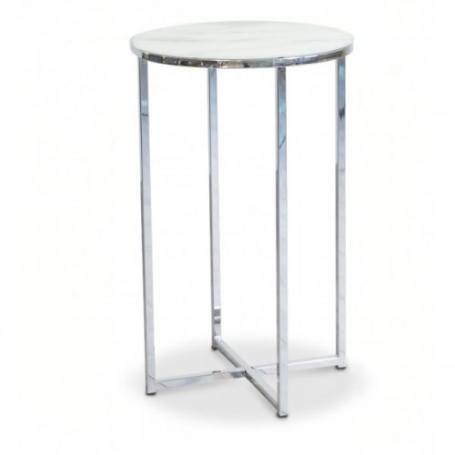 Den frostat glasskivan med en subtil ljus marmorering ger en känsla av lyx, utan att dominera rummet. Tillsammans med det kromade metallunderredet skapas en modern och glänsande kontrast. Denna kombination gör att Palasso sidobord både kan stå ut som en accent eller smälta in i en mer diskret inredning.