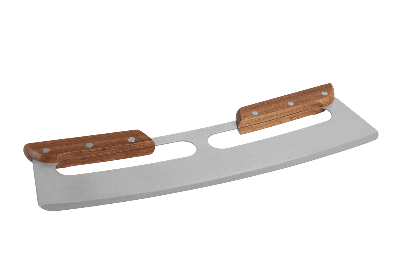 Att skära den perfekta biten av din hemmagjorda pizza är enkelt med en pizzaskärare i mezzaluna-stil från Pepper. Det dubbla handtaget i FSC-certifierat akaciaträ sitter bekvämt i handen när du skär med en gungande rörelse. En kniv i mezzaluna-stil är ett praktiskt tillbehör till ditt utekök och går lika väl att använda till att hacka örter och grönsaker.