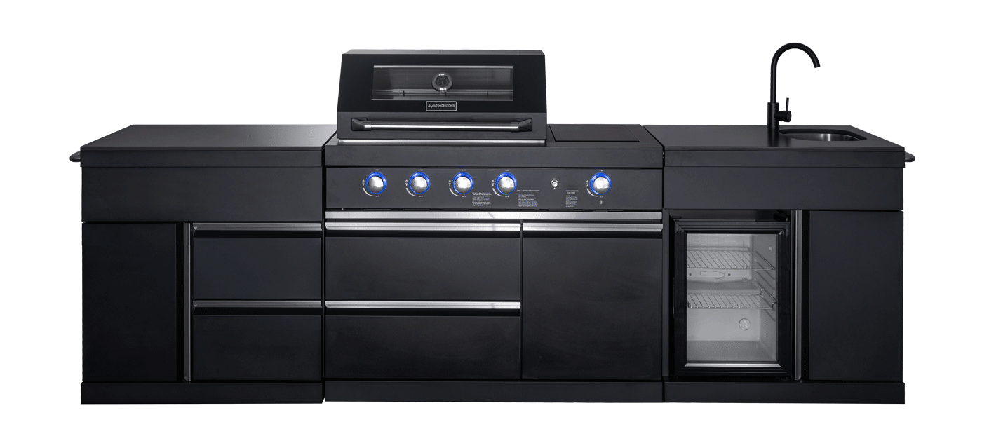 Stilrent fristående utekök i svart utförande i autentisk amerikansk stil. Pure Plus är ett färdigt fristående utekökspaket där du får all funktionalitet som du önskar för din matlagning utomhus – en stor gasolgrill med 4 effektiva brännare samt sidobrännare med infravärme, ett kylskåp till förvaring av dina råvaror och drycker, en rymlig diskbänk med integrerad soptunna i skåpsdelen samt ytterligare skåp med lådor med mycket förvaringsutrymme till alla dina grilltillbehör, handdukar och annat som du vill ha nära till hands. Pure Plus ger dig ett komplett och praktiskt sommarkök med användbara funktioner och bra förvaringsmöjligheter. Uteköket har en snygg och lätthanterad toppskiva i svart sintrad sten med marmorering som skapar en härlig atmosfär till din uteplats. Sintrad sten påminner om den eleganta designen av marmor och är på många sätt och vis det perfekta materialvalet för ett utekök – det är mycket hållbart, väderbeständigt och lätt att underhålla. Kort sagt kombinerar sintrad sten elegant design med extrem tålighet för att du ska kunna glädjas åt ditt stiliga utekök i många år.