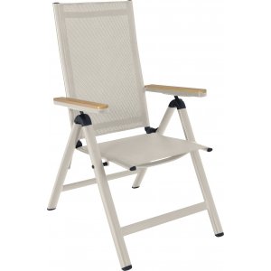 Den eleganta Svea positionsstolen har en aluminiumstomme med beige textilene och armstöd i ek-aintwood. Med möjligheten att fälla ryggstödet i 5 olika positioner kan användaren enkelt hitta sin drömposition och njuta av skön avkoppling.