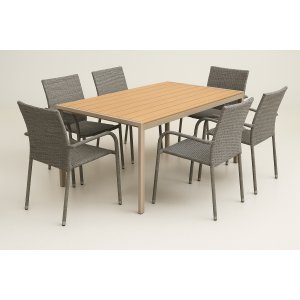 Skapa en lättmöblerad och stilren matplats utomhus med denna nätta men funktionella utegrupp. Det rektangulära Las Vegas-bordet i beige aluminium med naturfärgad Aintwood matchas med sex av våra mest klassiska utestolar Ida i grå konstrotting. En perfekt lösning för dig som söker både estetik och smart förvaring.