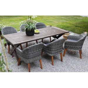 Denna utemöbelgrupp består av ett bord från Oxford-serien i kombination med 6 st stolar av modellen Valetta. Bordet har en robust konstruktion i brunbetsat trä och en generös yta som passar perfekt för utomhusmiddagar med vänner och familj. Stolarna är jordnära gråa med bruna ben och mörkgråa sitsdynor.