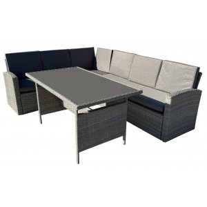 Uppgradera din uteplats med Moreno utesoffgrupp höger i grå konstrotting. Denna mysiga soffgrupp har en modern design och är tillverkad i metall och dubbel halvrund konstrotting för en exklusiv kvalitetskänsla. Med en härlig hörnsoffa och ett generöst matbord är denna grupp perfekt för familjemiddagar och sommarkvällar.