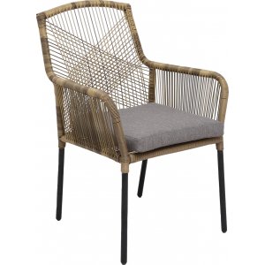 Ystad karmstol kombinerar stil och funktion med sin beige tvinnade konstrotting och grå dyna. Dynan är klädd i ett väderbeständigt och slitstarkt tyg, perfekt för långvarig användning utomhus. Stolens underrede är tillverkat av svart pulverlackerad aluminium, vilket ger en stabil men lätt möbel som är enkel att flytta runt. Ystad karmstol passar lika bra på altanen som i trädgården och erbjuder både komfort och elegans för dina utomhusmiljöer.