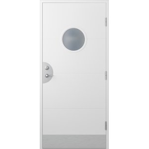 Ytterdörr Emilia med glas har en enkel stilfull utformning med spårfrästa horisontella linjer och karaktäristisk matt rostfritt stål som sparkplåt och handtagsskydd. Det charmiga runda fönstret och den matta rostfria stålen ger dörren en modern look som är lätt att placera in i den moderna miljön. Du har möjlighet att välja vilken färg du vill (med NCS-kod). För att både kunna matcha husets yttre och din inredning på insidan kan du välja olika färger på ytterdörrens insida och utsida. Standardfärgen vit NCS S0502-Y är inkluderad i priset.